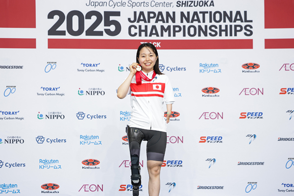 女子C2クラスは、中道穂香(テレビ愛媛)が2種目とも安定した走りを見せた。生まれつき右脚がなく、左脚のみでペダルをまわす中道。スタートからいかにスピードに乗るかという課題に向き合い、強化に取り組んできたといい、1㎞タイムトライアルでは日本新記録となる1分35秒064をたたき出すなど成果を見せた。中道は「パラリンピック出場が目標。これからタイムをどんどん伸ばしていきたい」と、力強く語った。